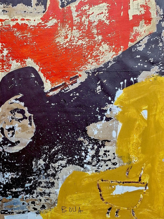 Armand Boua (b. 1978, Abidjan) is an Ivorian artist whose work portrays the resilience and vulnerability of street children. Using tar, acrylic, newsprint, and cardboard, he creates layered compositions where fading silhouettes emerge from textured surfaces, transforming decay into beauty. Balancing social critique with compassion, Boua’s paintings evoke memory, marginalization, and the quiet endurance of the human spirit.