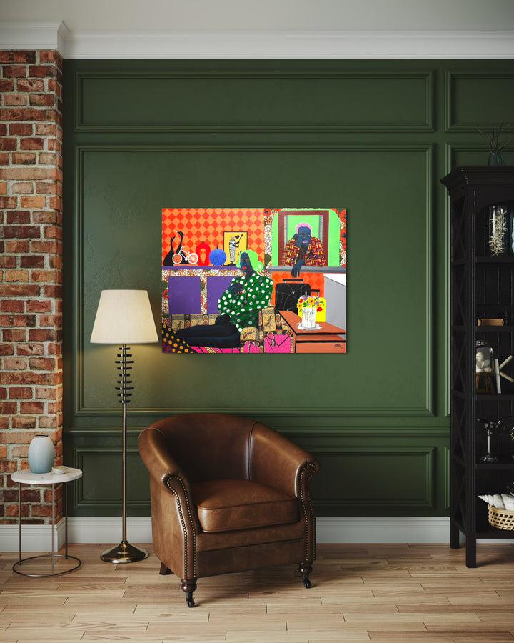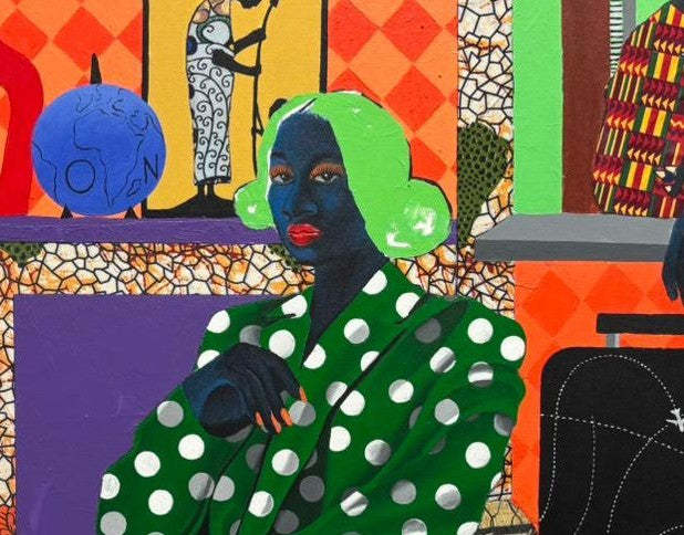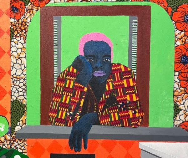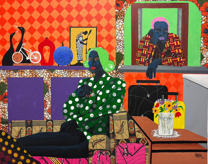 Through bold colors and fabric-inspired patterns, he echoes African textile traditions while questioning the cultural fragmentation caused by colonization and globalization. His art becomes both a reflection and a resistance - honoring ancestry while reimagining the present with tenderness and strength.
