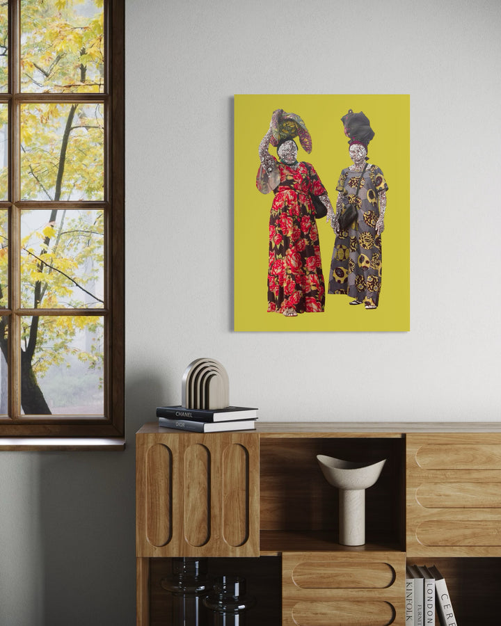 BISENGO YA BA TÁTÁ MWASI (The Aunties’ Happiness) by Uólofe Griot captures the radiant warmth and unity of African womanhood. This black art photograph, presented as a matte laminated print, celebrates shared laughter, tradition, and the vibrant pulse of community life.