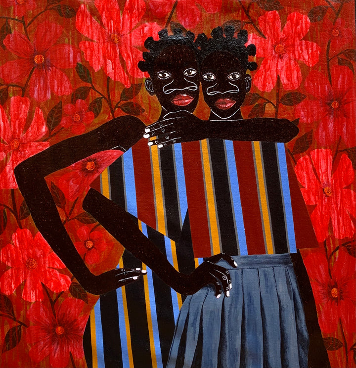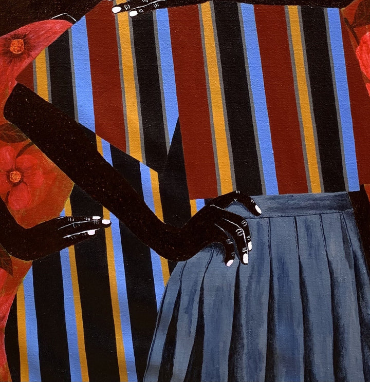 Akintomide’s art explores identity, culture, and human connection. Using ink and acrylic, he creates figurative portraits that highlight the beauty and resilience of relationships. His distinctive facial exaggerations—especially the nose—reflect personal experiences transformed into symbols of strength and individuality. Blending African and non-African fabric patterns, his work reimagines cultural ties and celebrates shared humanity through themes of identity, belonging, and connection.