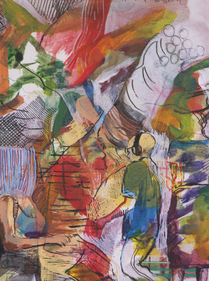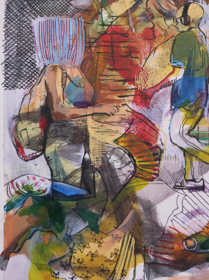 Through vibrant color and fluid brushwork, Mulalene transforms everyday scenes into reflections on belonging and Mozambican culture.
