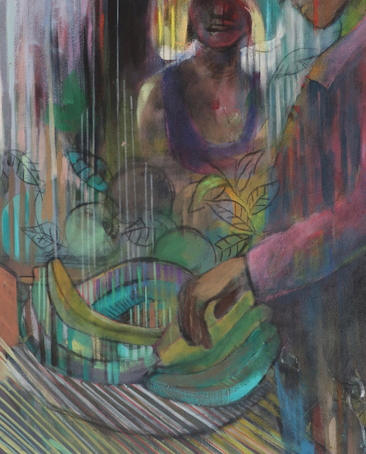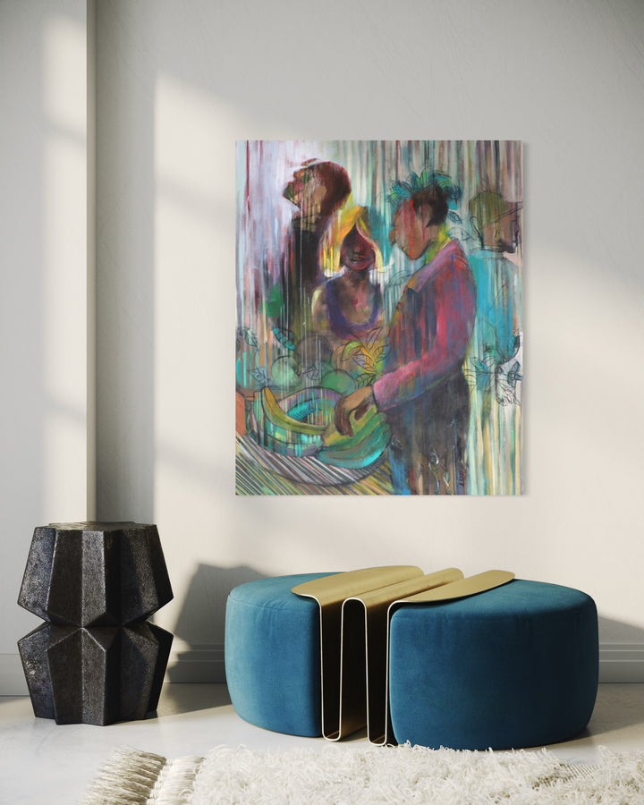 Through vibrant color and fluid brushwork, Mulalene transforms everyday scenes into reflections on belonging and Mozambican culture.