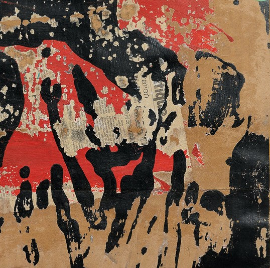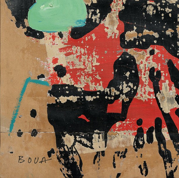 Armand Boua (b. 1978, Abidjan) is an Ivorian artist whose work portrays the resilience and vulnerability of street children. Using tar, acrylic, newsprint, and cardboard, he creates layered compositions where fading silhouettes emerge from textured surfaces, transforming decay into beauty. Balancing social critique with compassion, Boua’s paintings evoke memory, marginalization, and the quiet endurance of the human spirit.