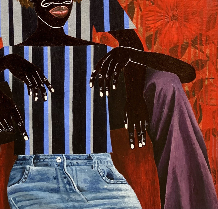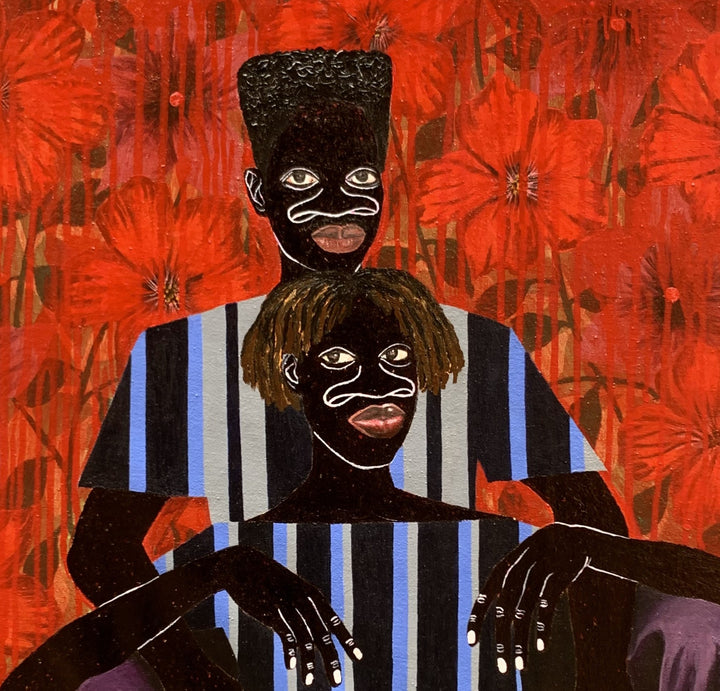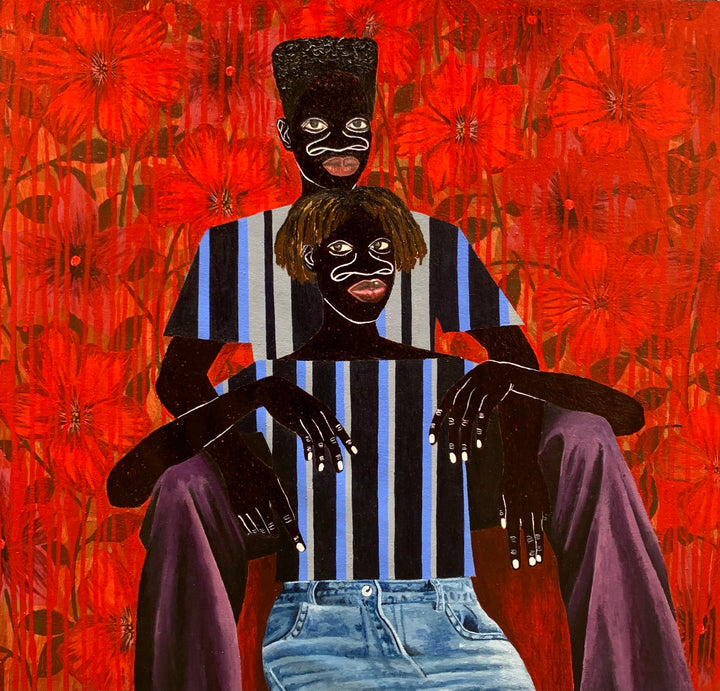 Akintomide’s art explores identity, culture, and human connection. Using ink and acrylic, he creates figurative portraits that highlight the beauty and resilience of relationships. His distinctive facial exaggerations—especially the nose—reflect personal experiences transformed into symbols of strength and individuality. Blending African and non-African fabric patterns, his work reimagines cultural ties and celebrates shared humanity through themes of identity, belonging, and connection.