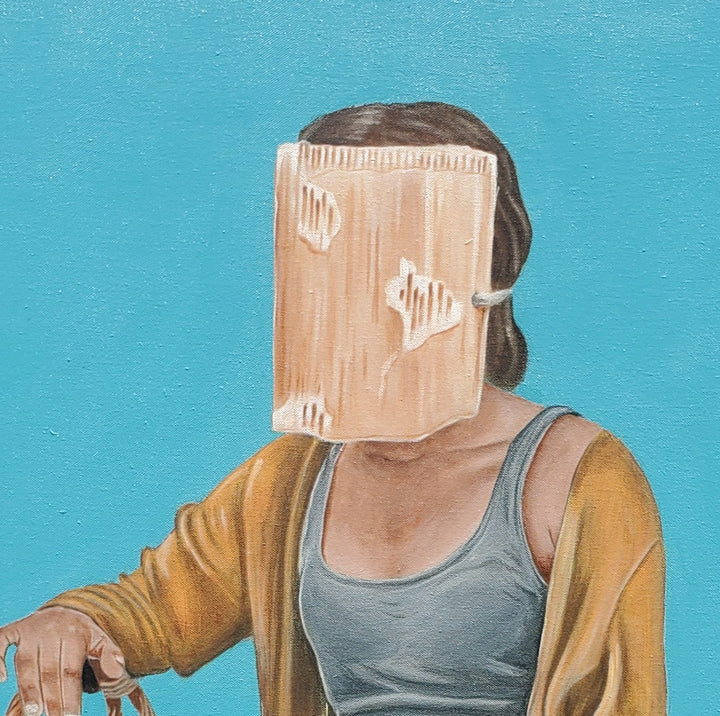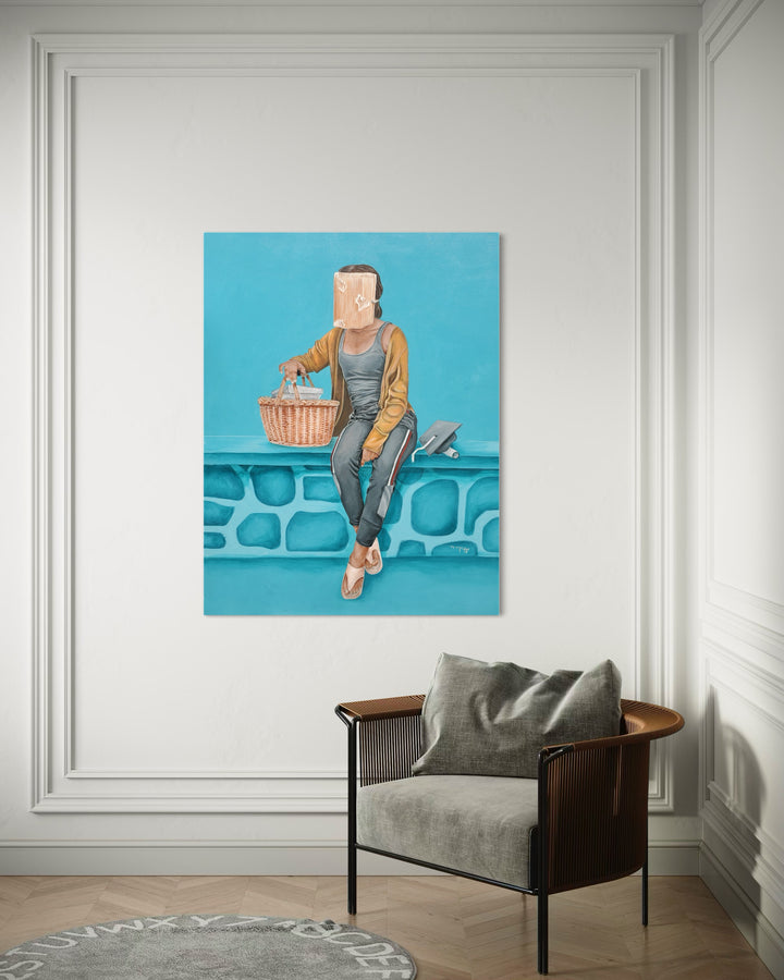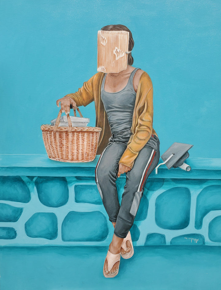 The work portrays a young girl seated, a figure at once fragile and steadfast, embodying the hopes of a youth in search of tomorrow. Around her, a woven African basket filled with books, an academic cap, and a diploma form a narrative of ascension through knowledge. These symbols remind us that achievement is never given, but earned—through effort, perseverance, and faith.