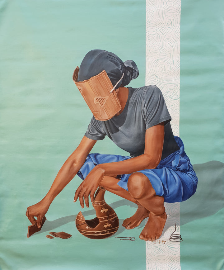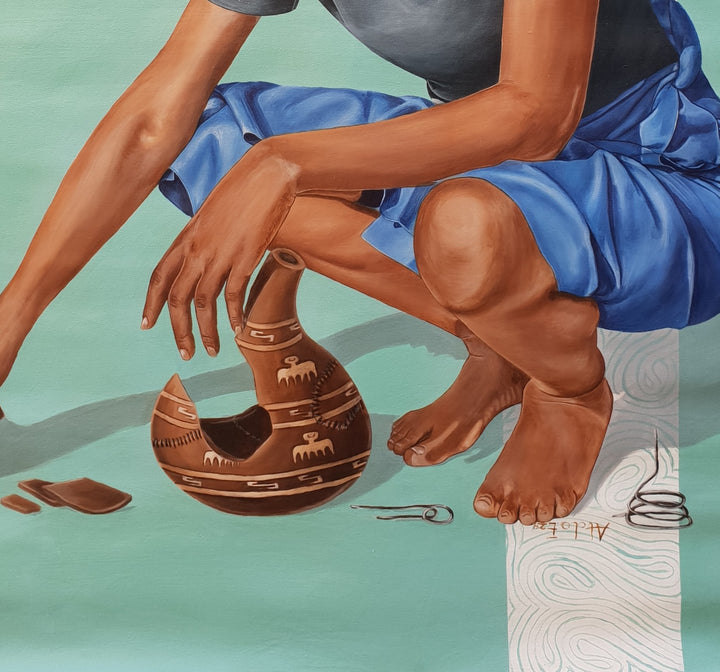 Resilience portrays inner strength and the capacity for renewal in the wake of rupture. The mended calabash—an emblem of tradition and feminine values—becomes a metaphor for the restoration of self, of culture, and of identity. Each stitch marks an act of patience, precision, and courage, transforming fragility into enduring strength.