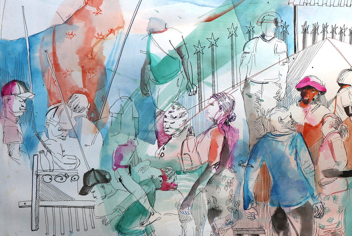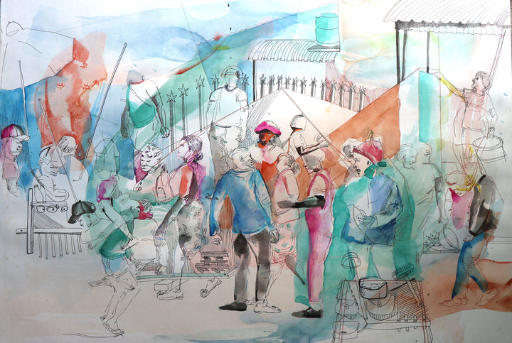 Through vibrant color and fluid brushwork, Mulalene transforms everyday scenes into reflections on belonging and Mozambican culture.