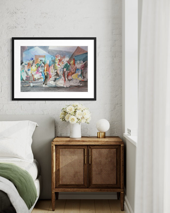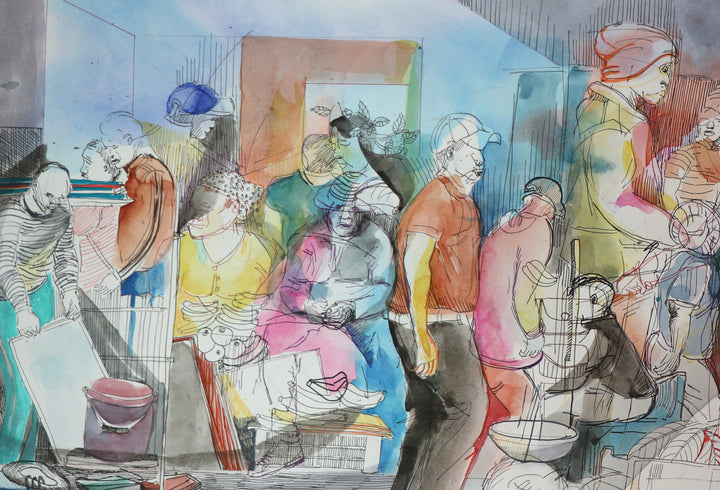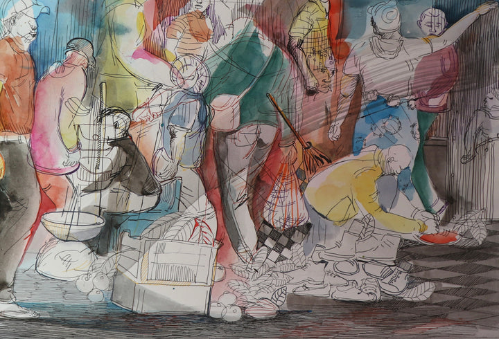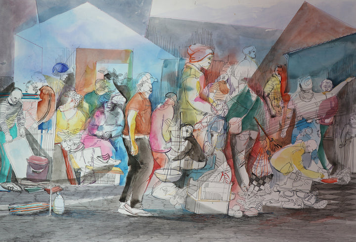 Through vibrant color and fluid brushwork, Mulalene transforms everyday scenes into reflections on belonging and Mozambican culture.
