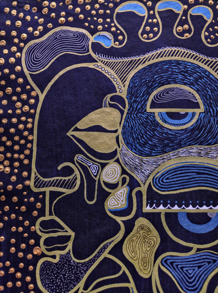 Chris Inácio’s practice reveals a deep engagement with form, identity, and emotional tension. Working primarily through line and texture, his compositions unfold as interlocking faces and abstracted figures — visual conversations between self and other, memory and myth. With a restrained, often monochromatic palette, Inácio constructs intricate emotional architectures where repetition and rhythm replace colour as vehicles of intensity. His works invite quiet contemplation: portraits that are less about likeness and more about presence — psychological, spiritual, and collective.