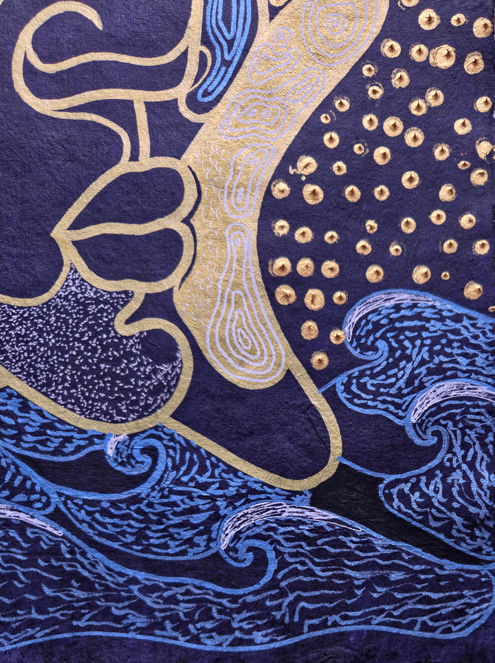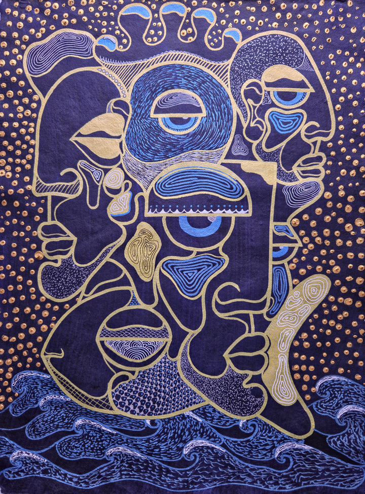 In Ritual, faces emerge and dissolve among sea waves and constellations of stars, forming a symbolic flow between the human and the cosmic. The features, at times defined and at others abstract, seem to breathe with the movement of the waters and the silence of the sky. The indigo paper, deep and nocturnal, serves as a portal for contemplation—a space where the visible and the invisible meet. The work evokes the idea of cycle, communion, and transformation, like a silent rite uniting body, nature, and the universe.