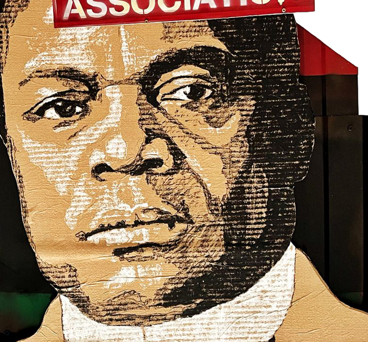 As an autodidact, he moved to Luanda in 2011, where he found the inspiration that helped define his urban interventions as visual expressions of life and thought. These are then materialized through compositions based on alternative materials such as cardboard, books with stains of acrylic paint and gouache, and pieces of magazines and papers, which he carefully selects in accordance with the specific political, social, and cultural topics addressed.