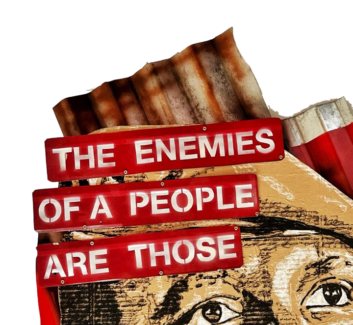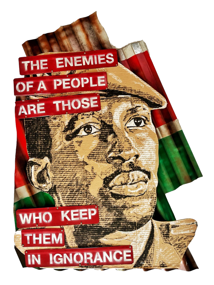 As an autodidact, he moved to Luanda in 2011, where he found the inspiration that helped define his urban interventions as visual expressions of life and thought. These are then materialized through compositions based on alternative materials such as cardboard, books with stains of acrylic paint and gouache, and pieces of magazines and papers, which he carefully selects in accordance with the specific political, social, and cultural topics addressed.