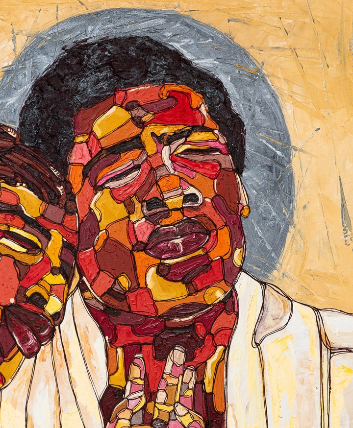 Blending African cosmology with Afro-Brazilian traditions, his layered compositions reflect heritage, vulnerability, and healing — positioning him as a vital voice in the Afro-Atlantic art discourse.